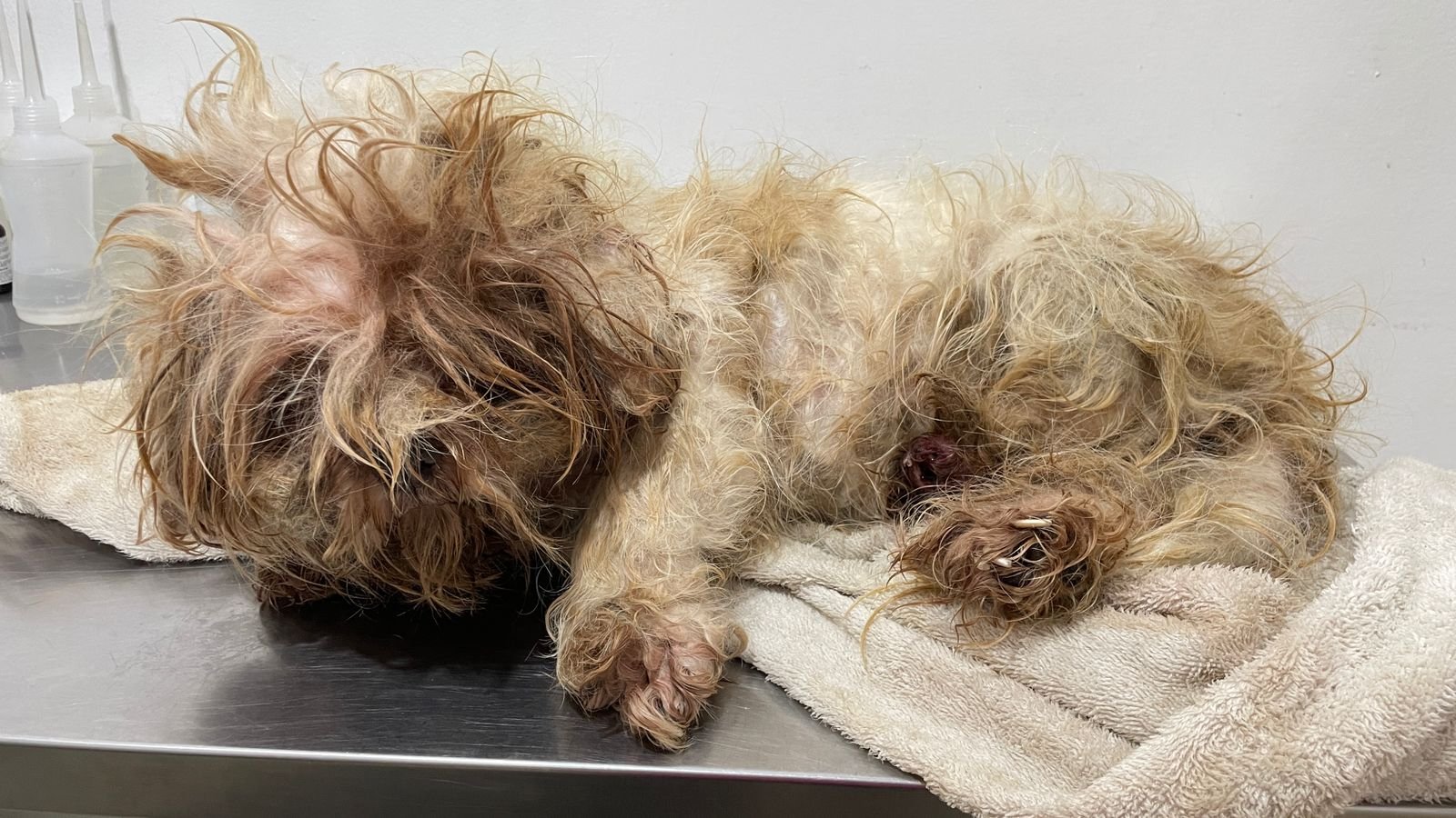O pet tinha larvas ativas em várias partes do corpo, necessidade de enucleação devido a bicheiras no olho, amputação de uma falange da pata dianteira, amputação da pata traseira, além de limpeza de miiases, bicheiras pelo corpo.